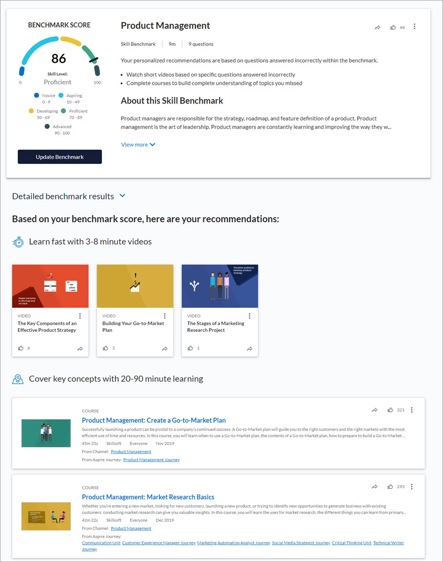 You can also view other learning recommendations located at the bottom of the skill benchmark results page.