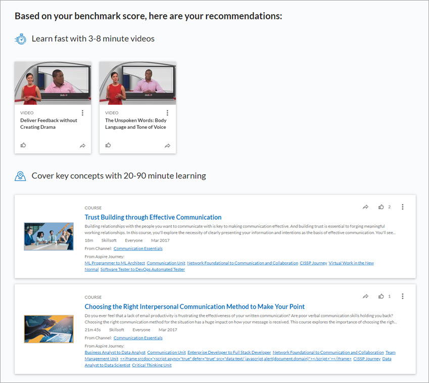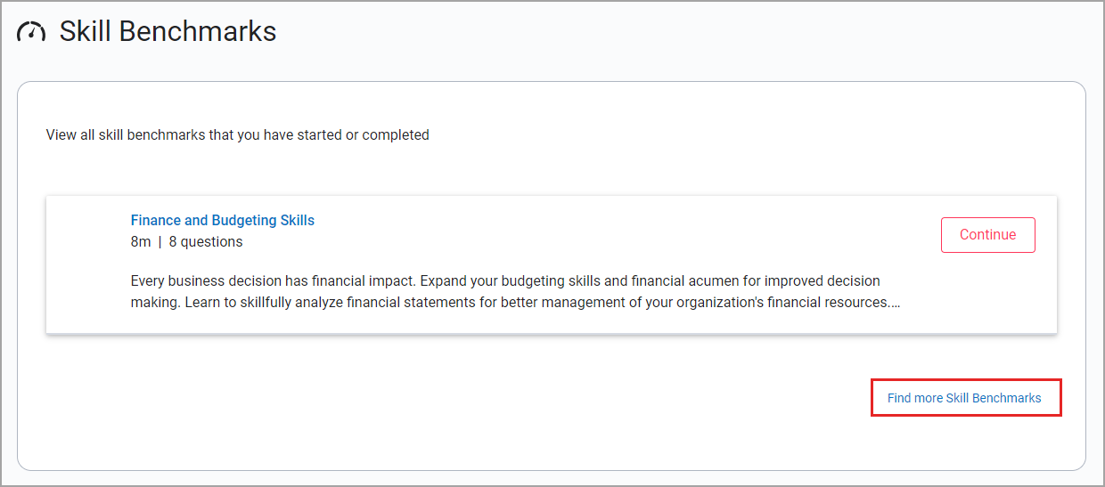 - In a journey. If you access a skill benchmark from a journey, you will not see recommended content when you finish the benchmark. Instead, you will see a button to Continue Journey.