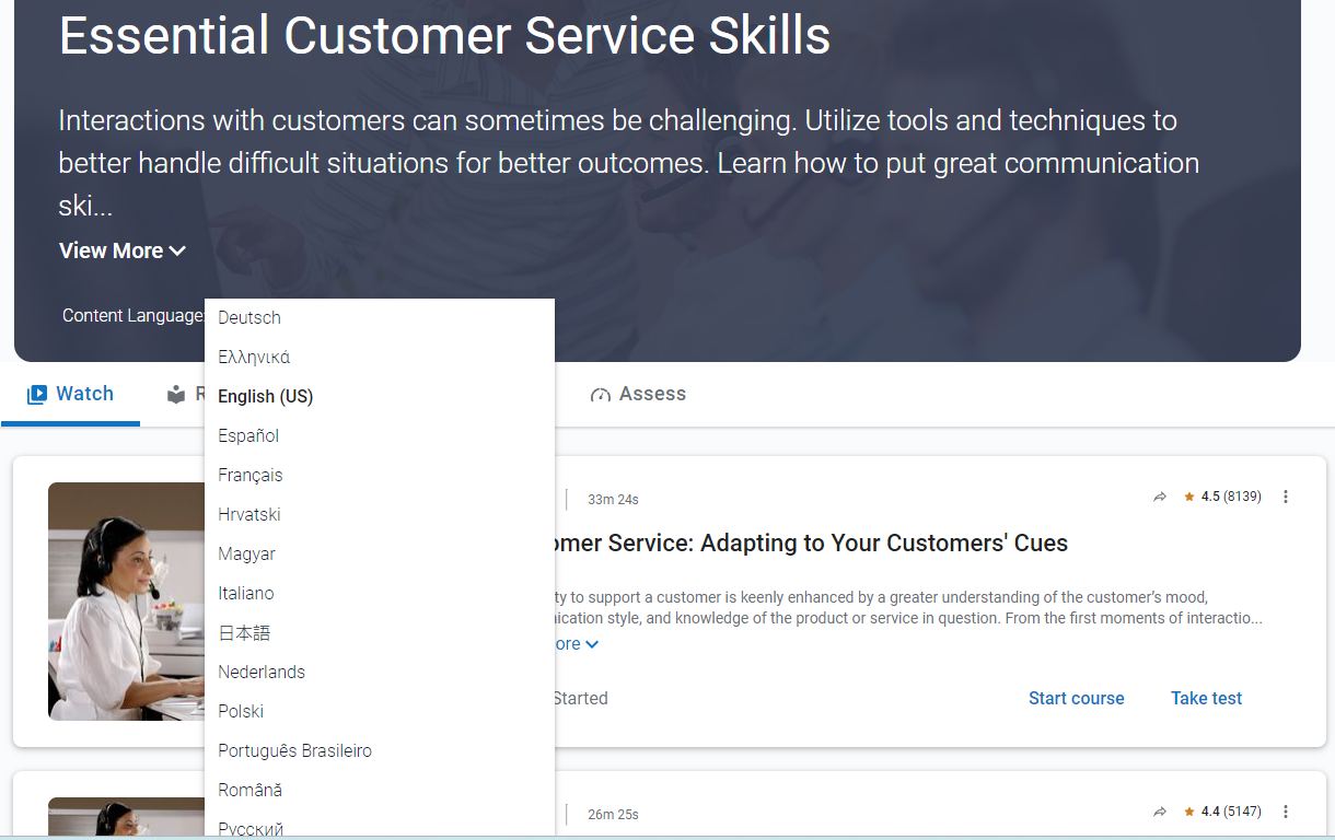- Content language: If the channel has content available in other languages, you have the ability to switch to another language. When you switch to another language, you only see content items that are available in that language.