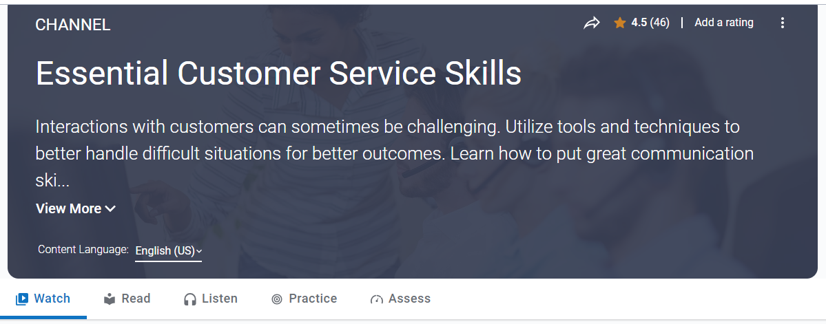 A channel is where you can go to find all content about a particular subject area of interest. Channels present several types of content, using different views and presentation options to assist you with determining what content best meets your needs. Channels are the core building blocks of the Skillsoft Platform library.