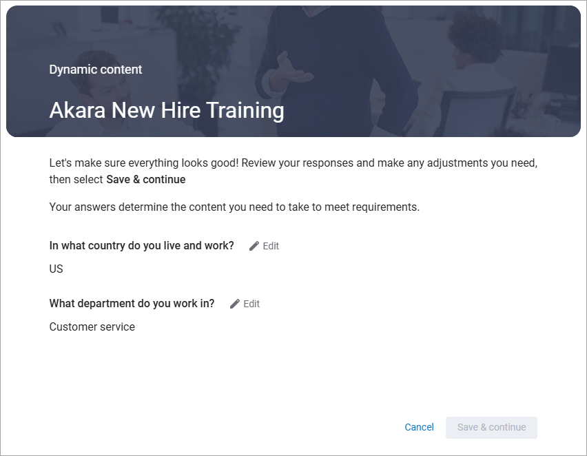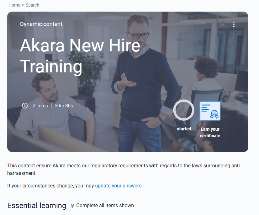 Dynamic Content prompts you to answer a series of questions. Based on your answers, you receive a set of one or more content items, such as courses, books, and videos. You must complete all items in the set to achieve completion of the dynamic content.