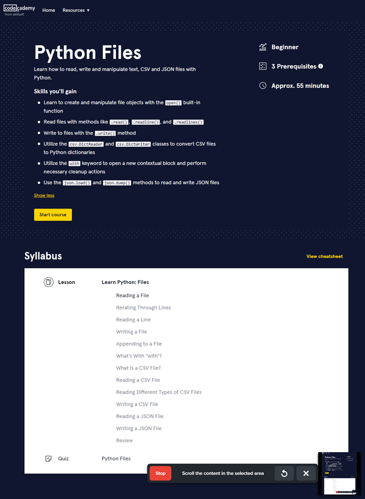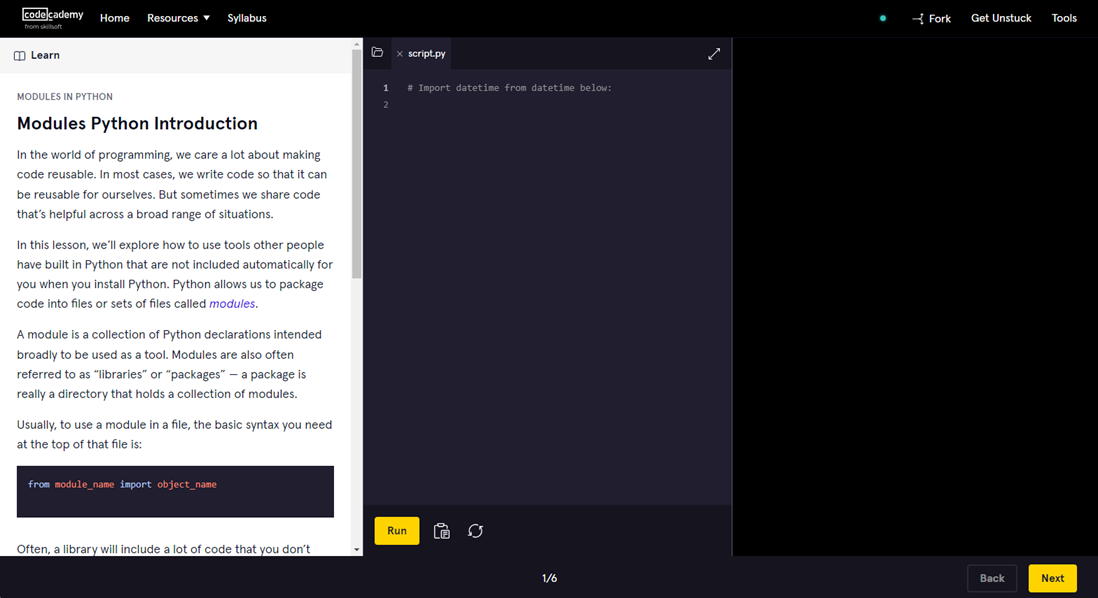 - Documentation: Find links to additional Codecademy documentation on the topic you are learning.