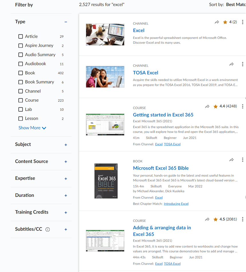 - Type: provides all asset types available that match your search terms. Select the types of content for how you want to learn. The most commonly searched for content types are types pinned to the top of the list.