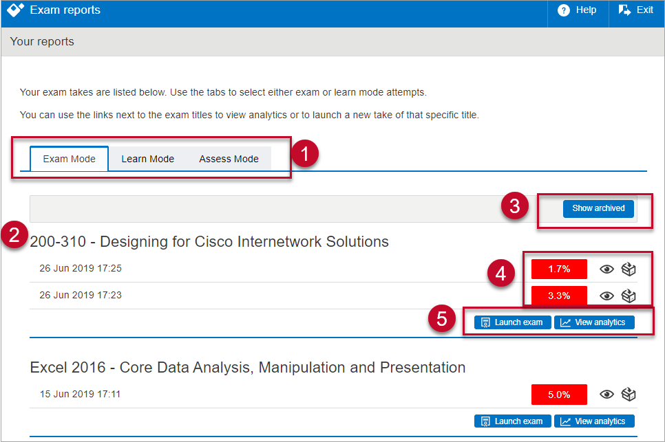 The Reports view allows you to view reports for either exam or learn mode attempts, and view analytic or retake an exam.