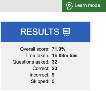 Learn mode displays your overall score, time taken, number of questions in the exam, and the number of questions answered correctly, incorrectly, or skipped.