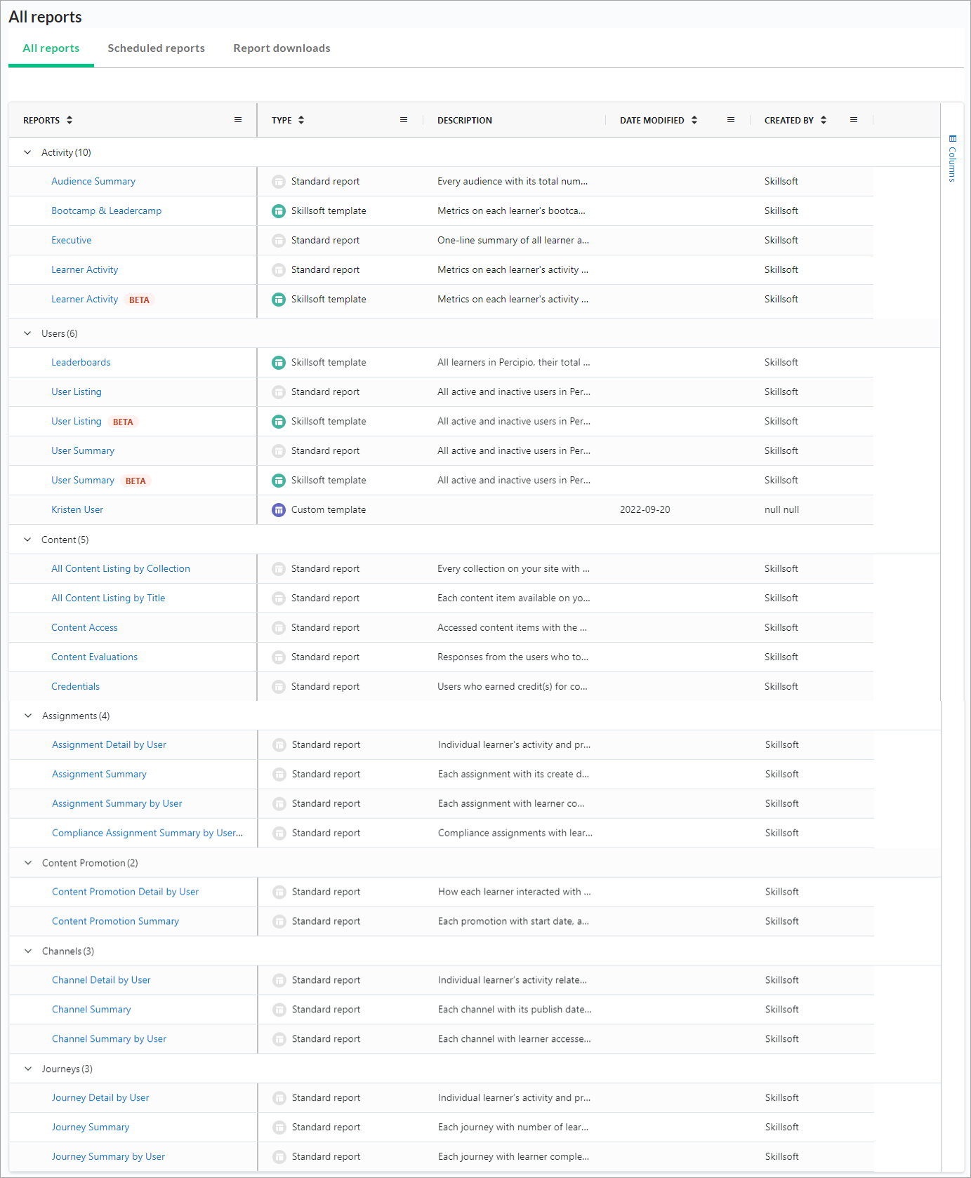 - Switch to the All reportstab. A full listing of reports and their descriptions displays.