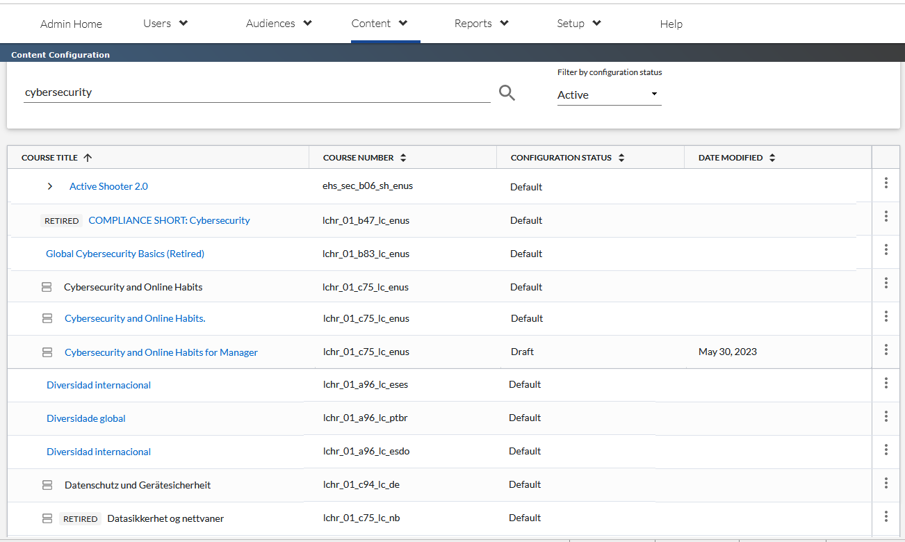 - Active: Shows all active courses including their configurations, grouped by the original Skillsoft course.
