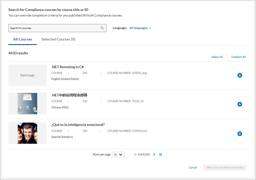 3. Search for course(s) you wish to override. You may filter the search by language if desired.