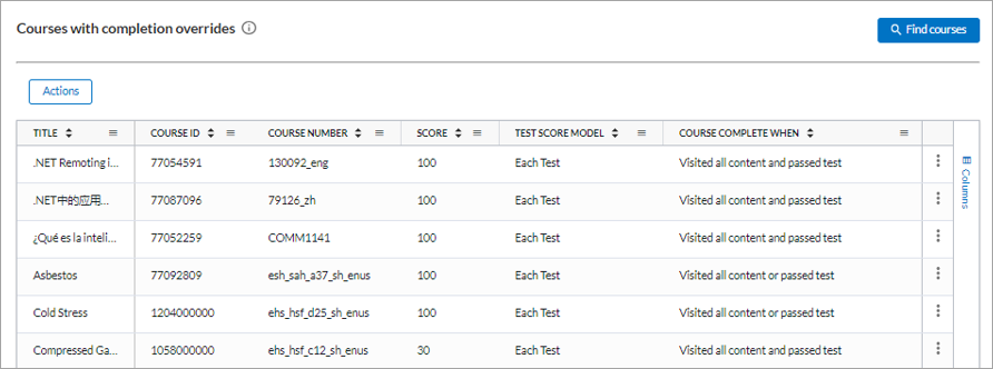 2. From the Courses with completions override section, select Find courses.