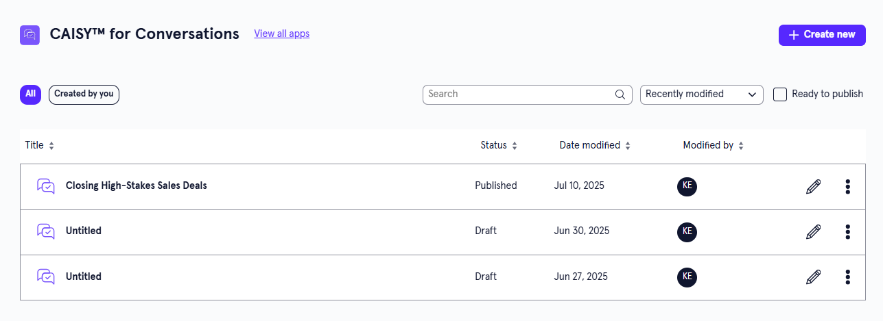 You can access all simulations you created from the CAISY for Conversations page. Here, you also see simulations you have been invited to collaborate on within the selected workspace. For detailed instructions on creating a new simulation, see Create a CAISY for Conversation.