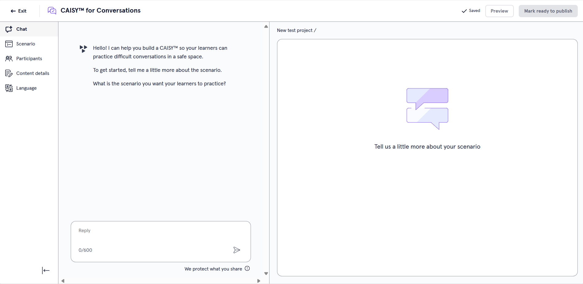 • Scenario Prompt: The tool uses the answers you supply in this section to generate the sample simulation, so you should be specific and provide as much detail as possible.