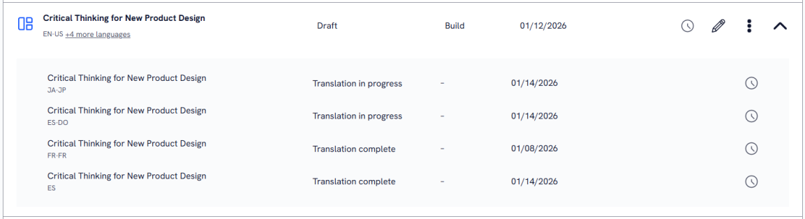 If you create translations for a course, you can see them on the Course Designer list view page. Locate the course from the list, and select the Show translations icon