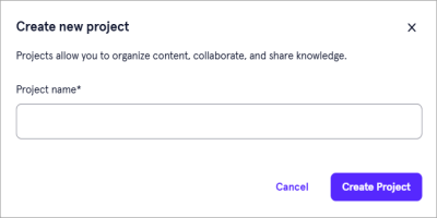 Projects serve as folders that contain content. They help organize your custom content and allow you to manage who has access to it. Projects are associated with a specific workspace, and have access to the knowledge sources from that workspace. When you create a project in a workspace, only you can see it until you share it with others.