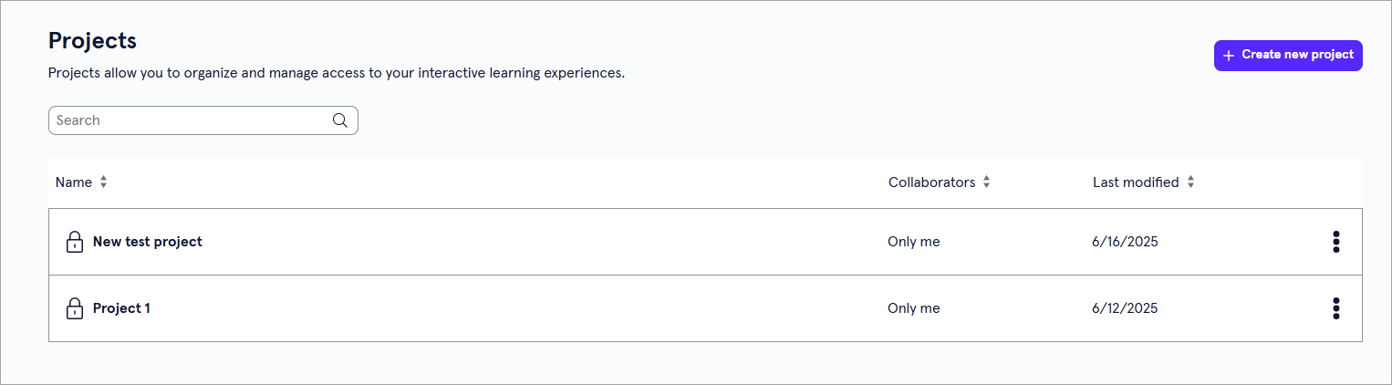 On the Projects page, you see a list of all projects in that workspace that you have access to. To find a specific project, you can locate it from the list of projects or search for it using the search bar in the upper left.