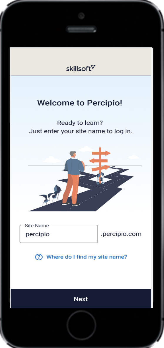 - Enter your Percipio site name. You only have to enter this once, Percipio remembers it for you.