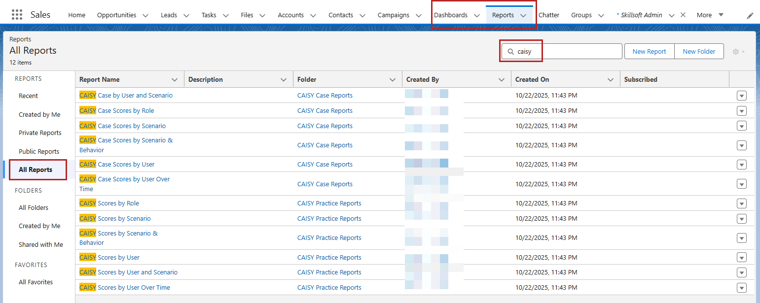 - CAISY Scores by Role: This report shows for each role defined in Salesforce that is associated with a learner who accessed a Skillsoft CAISY scenario, how learners with that role scored on different scenarios. For each role you see all users with that role, the scenario they accessed, and their score. Use this report to get an understanding of how different roles are performing.