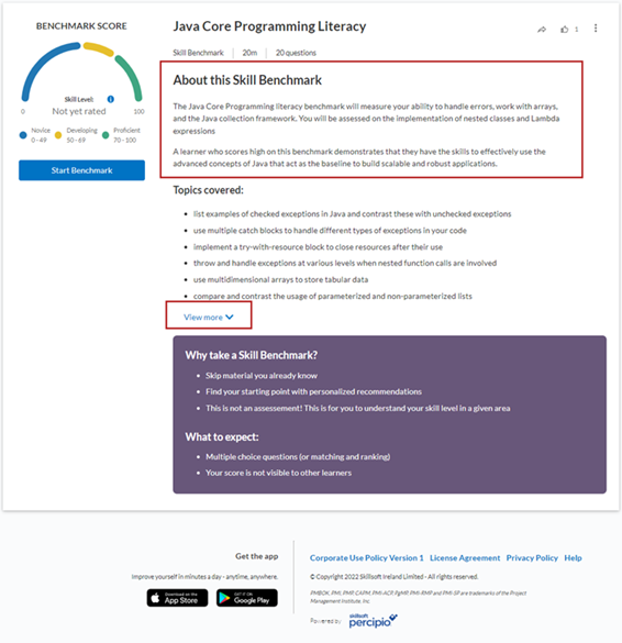 When learners select a Skill Benchmark from the library or search, they now see an About section describing what skills are covered with the benchmark. They can use the About section to decide if that benchmark is right for them.