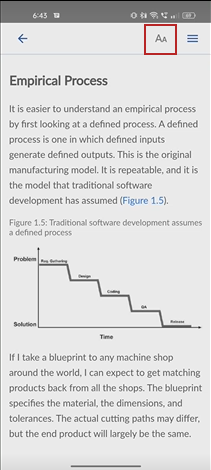 Learners can now choose dark and warm themes when reading a book in the Percipio mobile app. They can also choose to increase or decrease the font size of text in book reader.