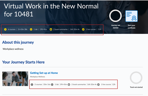 When a learner views a custom track or journey, they now see specific detail about the types of content contained along with total expected duration for each type. Previously learners just saw the total number of content items and total expected duration of all types. If a journey contains multiple tracks, the values in the journey banner reflect the sum of all items in all tracks.