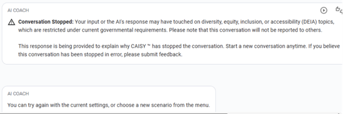 When learners, who work for the US Federal Government or other companies with DEI restrictions, launch a CAISY simulation, they may see new messaging if they try to engage CAISY in a conversation that is outside the guardrails specified by the current U.S. regulatory requirements related to diversity, equity, inclusion, or accessibility (DEIA) topics.
