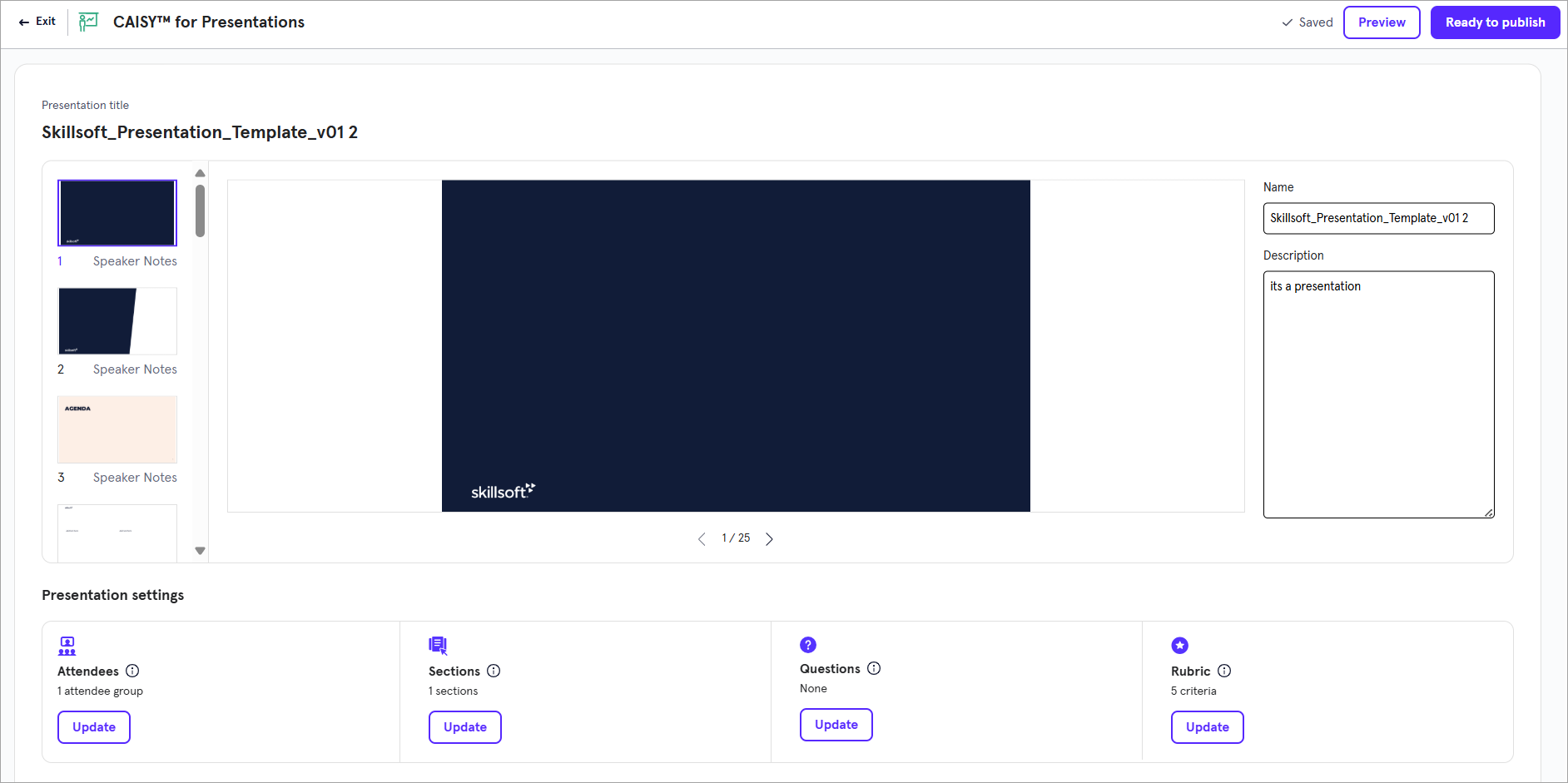 - By default, the Name of your presentation shows as the file name, but you may choose to give your presentation a different name. Enter a Description for your presentation. These are shown to learners when they are browsing content.