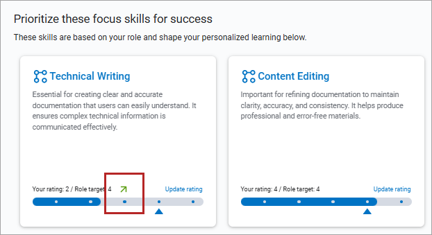 Learners now see a visual indication on their focus skill cards of their progress based on recent learning activities. This feature highlights the impact of recent learning hours on skill advancement. This visual cue aims to encourage continuous upskilling by providing learners with immediate feedback on their progress.