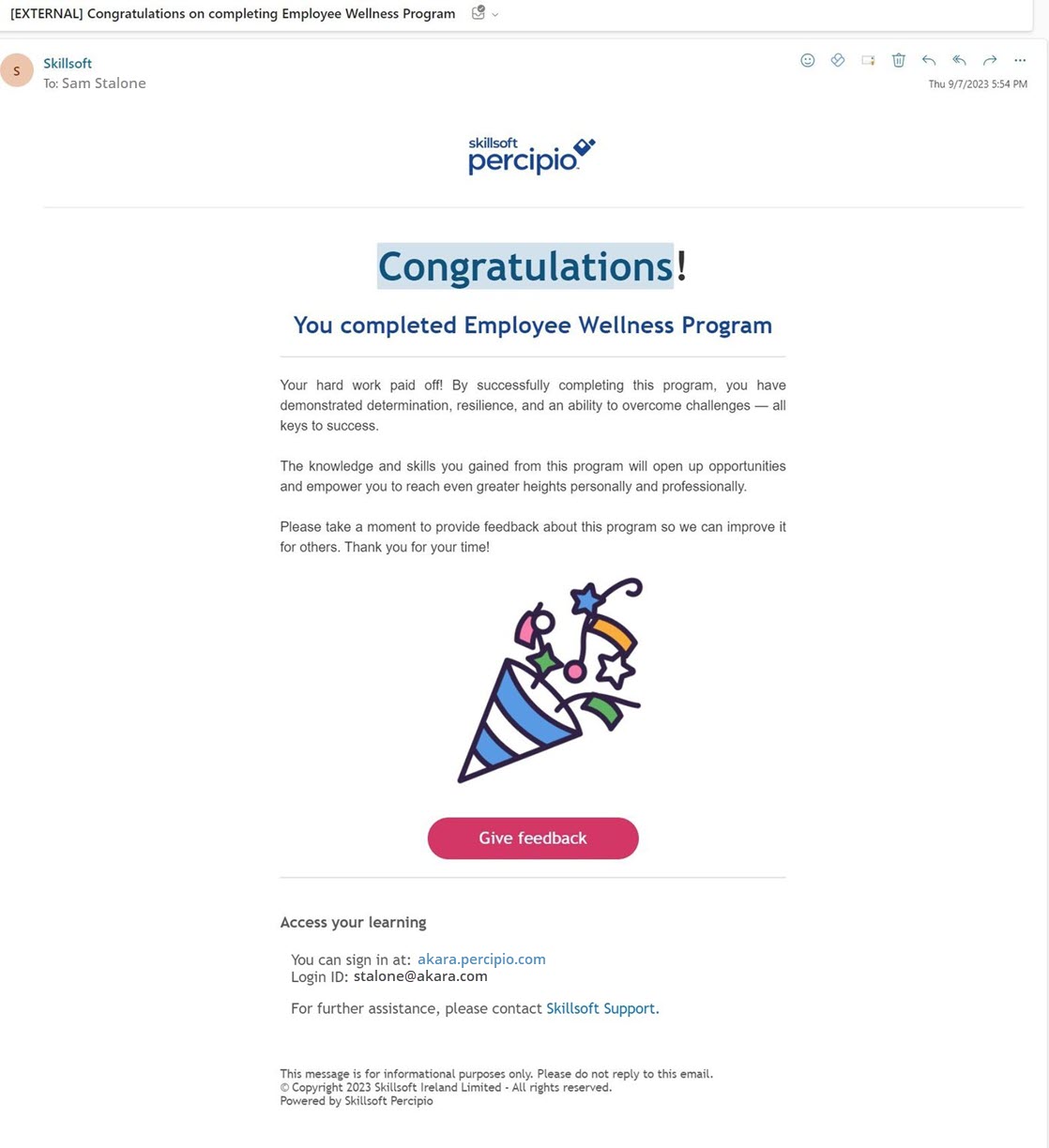 There is one completion notification. You can turn it on or off and customize it separately for each cohort. Learners receive this email when the complete the learning program.