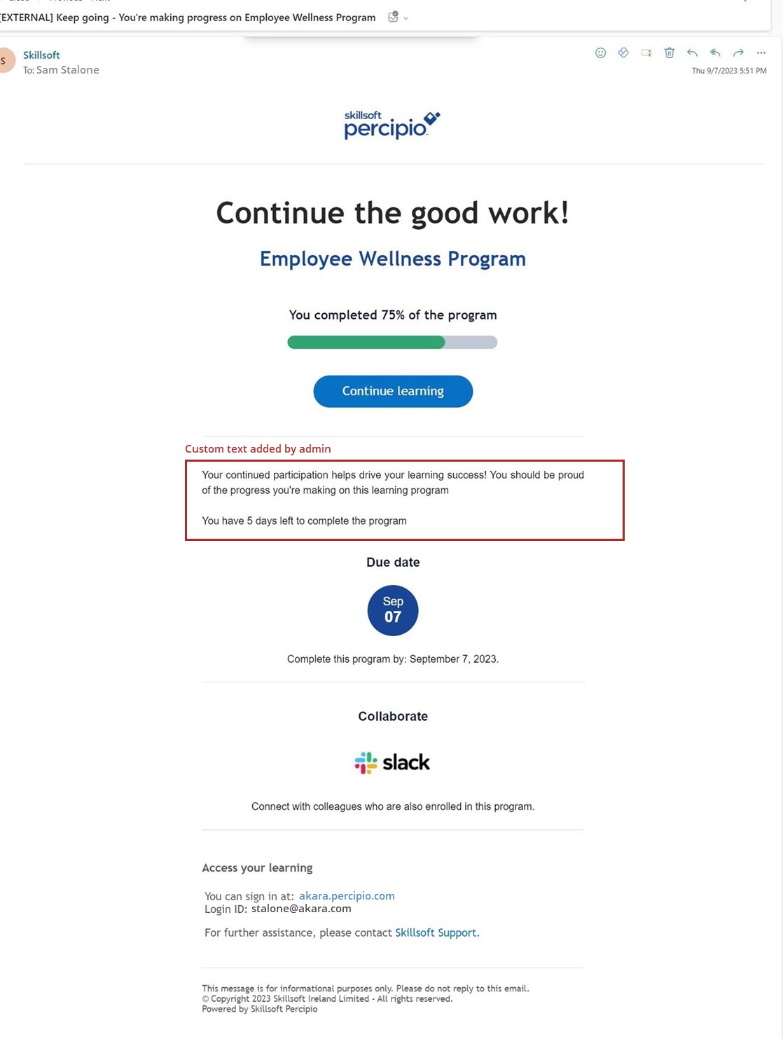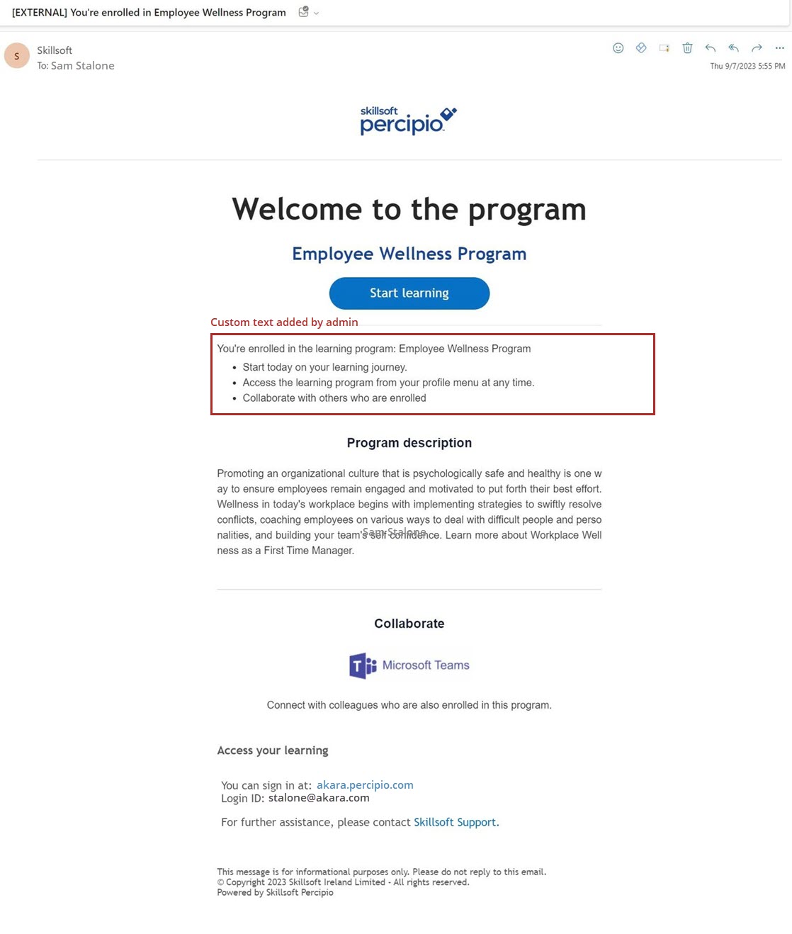 Learning program email notifications contain the details of and links to a learning program in Percipio to help inform your learners and get them excited to participate. There are three types of notifications for all learning programs. Each one can be turned on or off and customized separately for each cohort. The three types are: