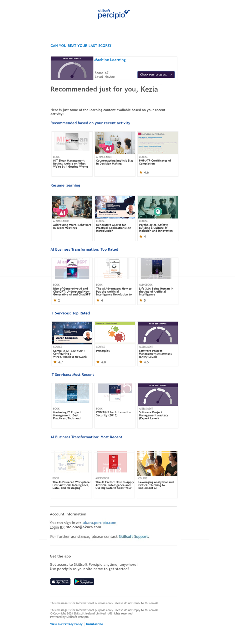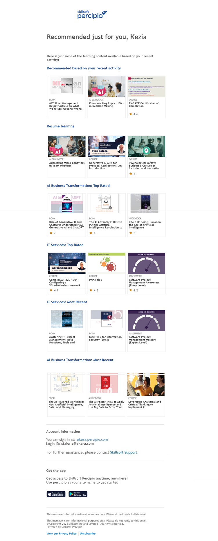 These emails capture learners’ attention with personalized subject lines and learning recommendations based on recent activity, content to resume, and their skill interests. The recommendations include all content types, including custom and linked content. When learners click on a link within the email, they are automatically logged into Percipio with the corresponding page or content item opened. The automatic login only works once per email per user and expires after 60 days. That means, if learners attempt a second click within the email, they are prompted to log in.