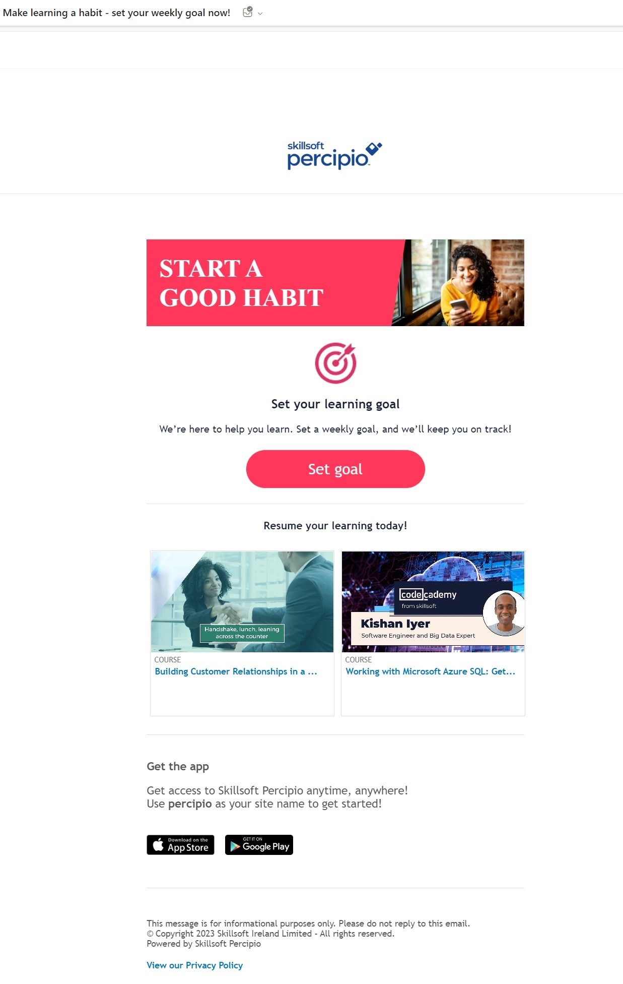 - If a learner does not reply by clicking Unsubscribe in the email, opting out on their Account Information page, or by signing in to Percipio and accessing content, they receive a reminder email each week until they consume content, or until a total of 12 emails are delivered, whichever comes first.