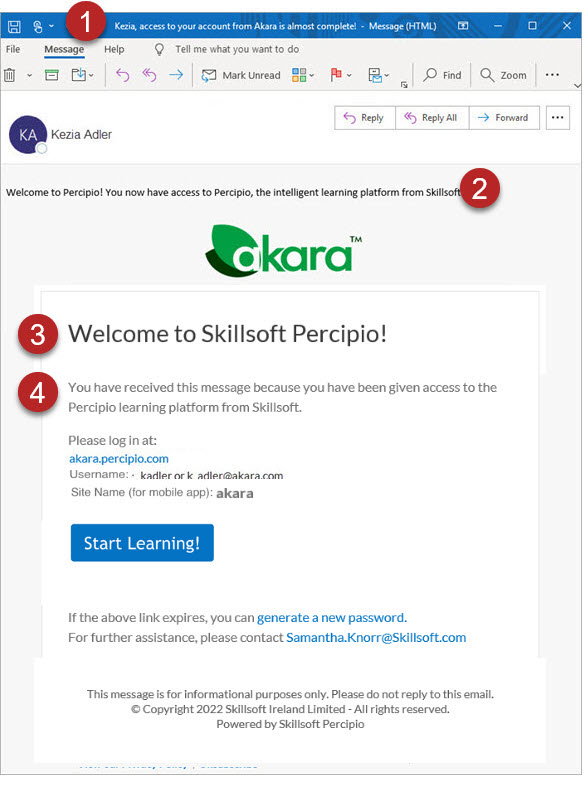 Only learners receive this type of welcome email. Any other Percipio user role who receives a welcome email, is provided a link to the site, a username and temporary password.