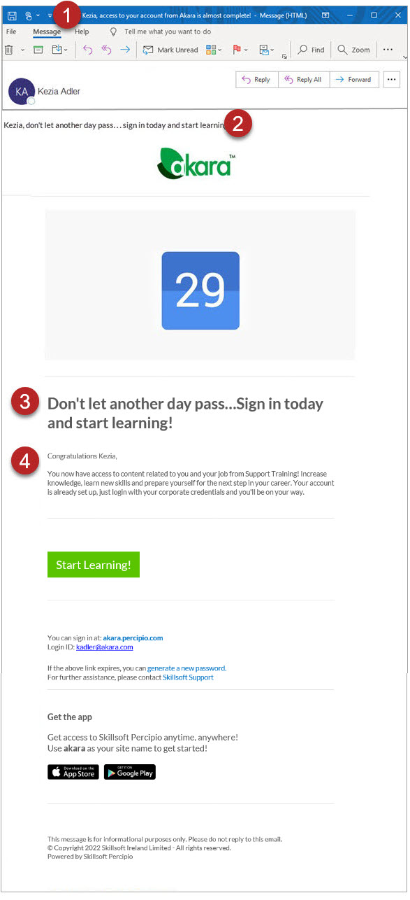 Welcome emails are sent directly to your learners from Percipio. The email contains a link that when clicked automatically signs the user into Percipio. The link is active for 60 days and can only be used once.