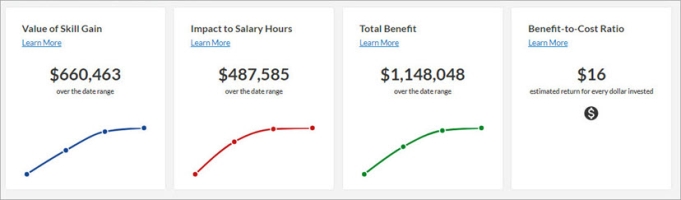 The Program Value dashboard provides insight into your eLearning program. The highly visual metrics, along with the detailed reports, deliver important information that you can use to understand and manage your organization's learning hours and estimated program value.