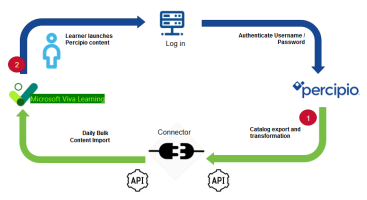 The diagram below represents both the learner flow from MS Viva Learning to Percipio and the flow of data from Percipio to MS Viva Learning. Each numbered area of the diagram is described in more detail in the following numbered sections.