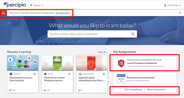 Les parcours de formation Compliance sont accessibles directement depuis l’écran d’accueil de Percipio. Une superposition de bannière et une carte d’annonce dans le widget des parcours informent les élèves que des parcours Compliance sont dus.