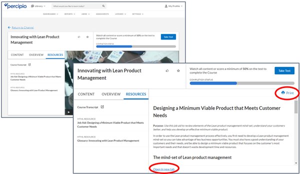 Au niveau du cours, ces fichiers sont disponibles dans l’onglet Contenu ou Ressources. Le contenu s’affichera en ligne au sein du cours lui-même ou dans un nouvel onglet. Vous avez également la possibilité d’imprimer le fichier.