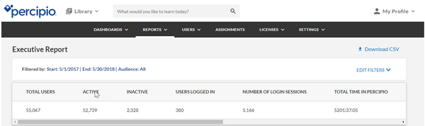 Ce nouveau rapport affiche tous les utilisateurs actifs et inactifs, des données pour une période spécifiée concernant la session d’utilisateur unique, le nombre de sessions de connexion ainsi qu’un résumé de chaque session d’utilisateur. Vous pouvez également voir le temps total passé sur Percipio, les utilisateurs accédant à du contenu, le nombre total d’accès au contenu et les accès titres uniques.