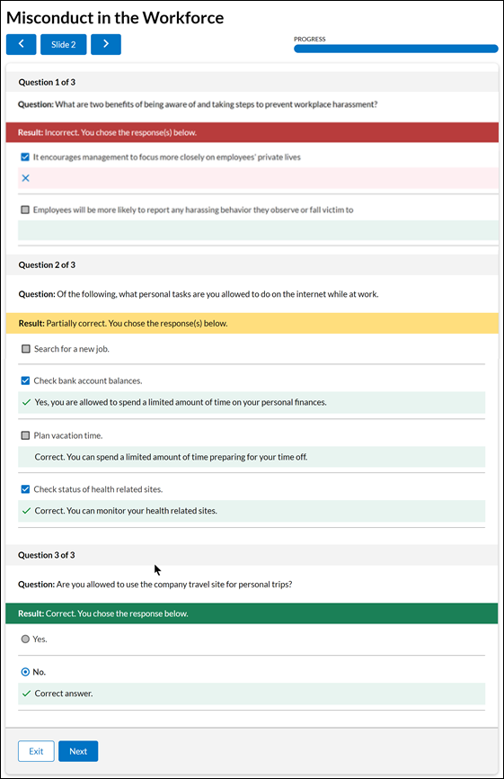 一旦完成评估,第一张带有问题的幻灯片就会显示出来,这时您就可以查看您的答案了。您会看到您标记正确和错误的答案。您还可以看到每个答案的反馈。