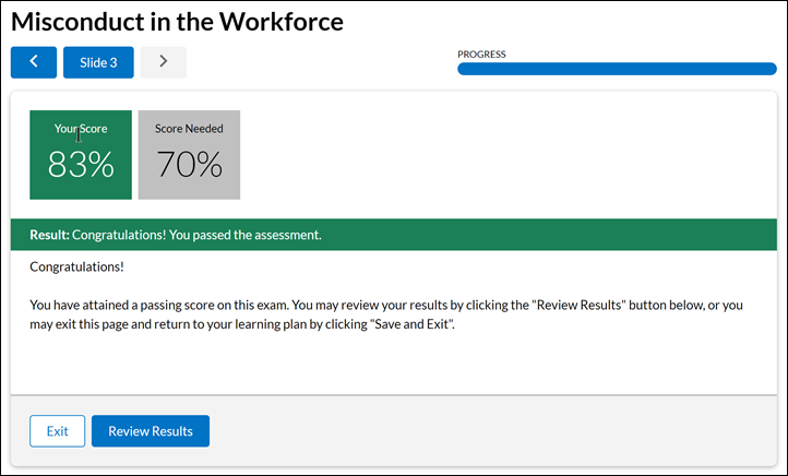 单击下一页查看您的分数和通知,了解您是否通过评估。